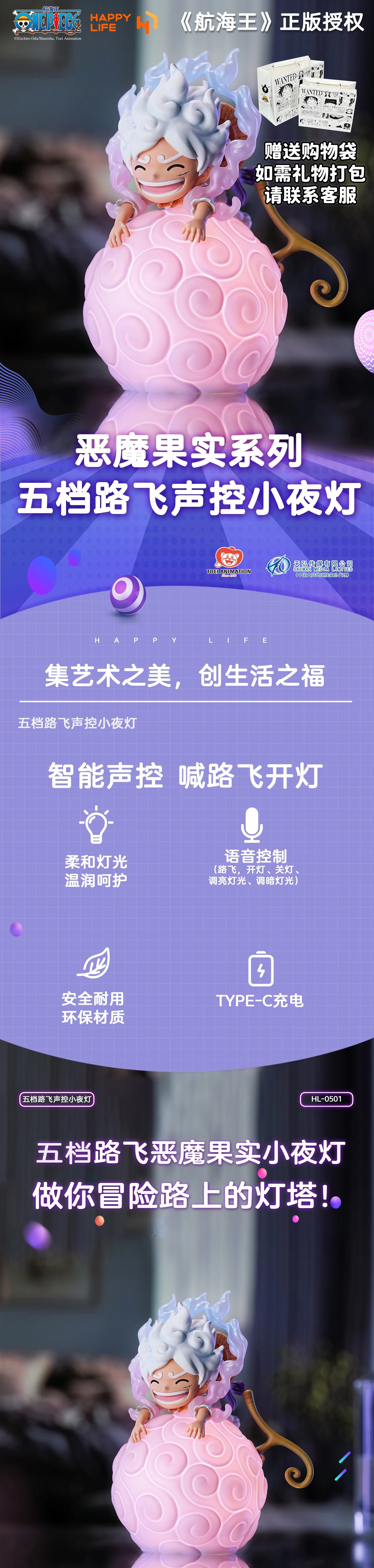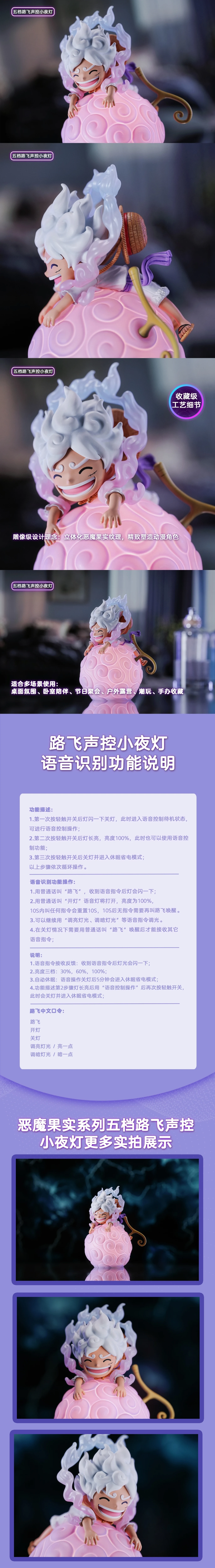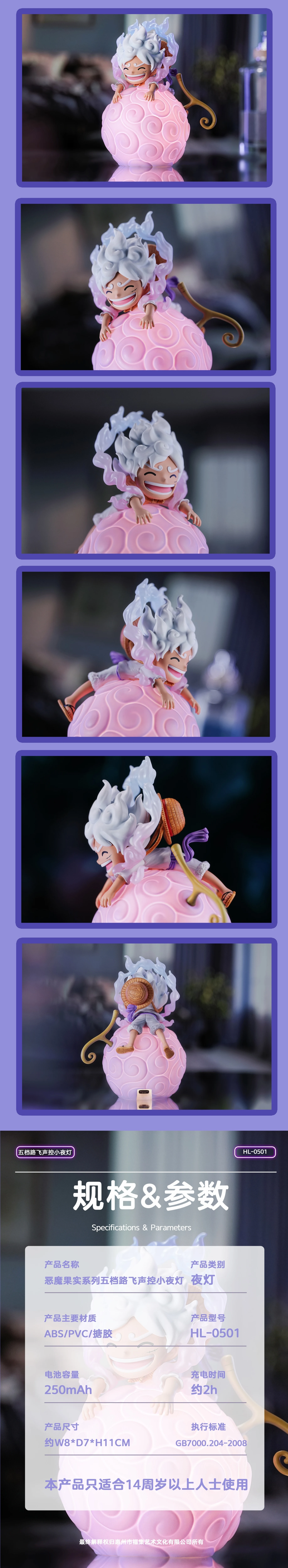 Inspired by the Devil Fruit universe from One Piece, this voice-controlled night light is crafted with premium ABS, PVC, and vinyl materials. Its compact size makes it ideal for desks, bedside tables, shelves, or gaming setups.