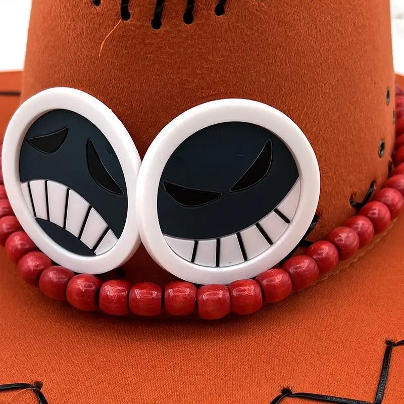 This One Piece Fire Fist Ace hat is inspired by the legendary character from One Piece. Made from lightweight polyester fabric, it works as a stylish sunshade hat while also serving as a cosplay and performance prop.